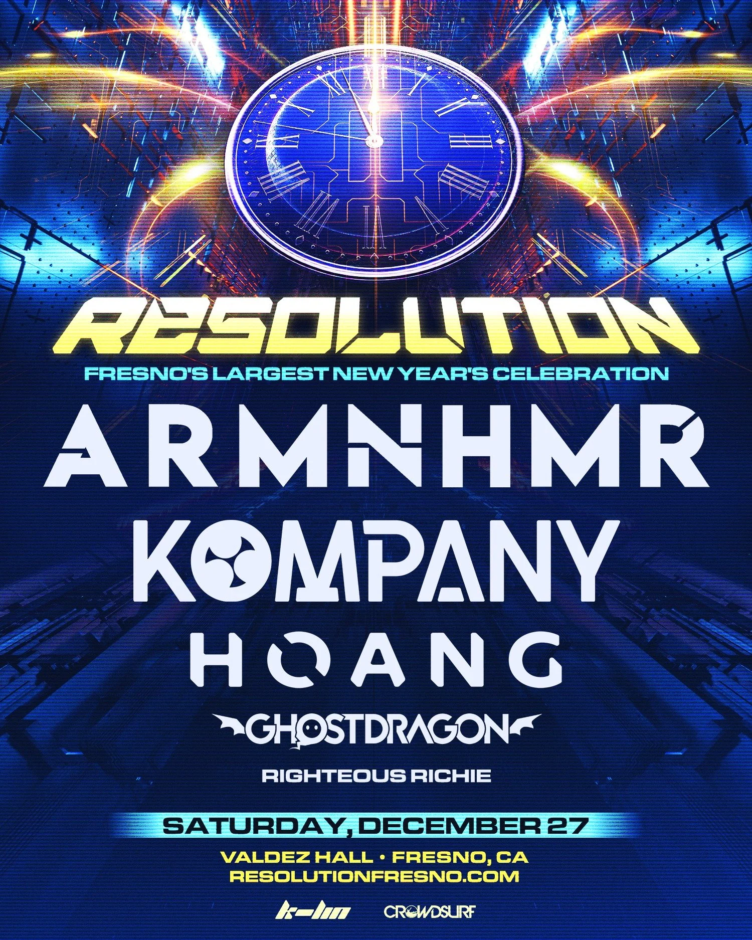 RESOLUTION returns as Fresno’s largest New Year’s celebration — a massive night of EDM, lights, production, and full-scale festival energy. Join thousands at Valdez Hall for a stacked lineup featuring ARMNHMR, Kompany, Hoang, Ghostdragon, and Righteous Richie as they deliver an electrifying countdown experience.